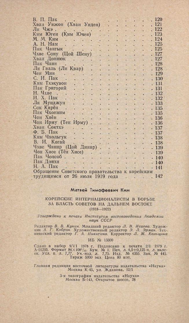 Корейские интернационалисты в борьбе за власть Советов на Дальнем Востоке (1918-1922) / М. Т. Ким ; [авт. вступ. статьи В.К. Пак, Ф.И. Шабшина, с. 3-38]. - Москва : Наука, 1979. - 144 с., 2 л. ил.