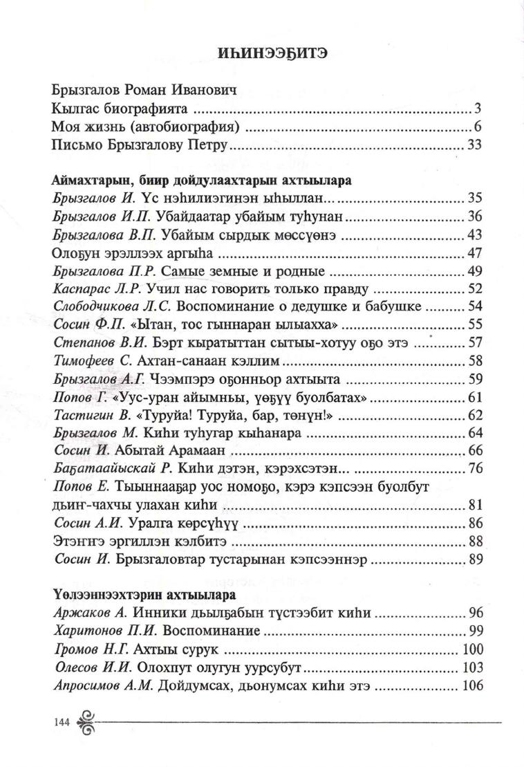 В книгу вошли воспоминания о видном общественно-политическом деятеле, заслуженном работнике народного хозяйства ЯАССР, отличнике профтехобразования СССР, Почетном гражданине Мегино-Кангаласского и Оймяконского улусов, ветеране Великой Отечественной войны Р. И. Брызгалове