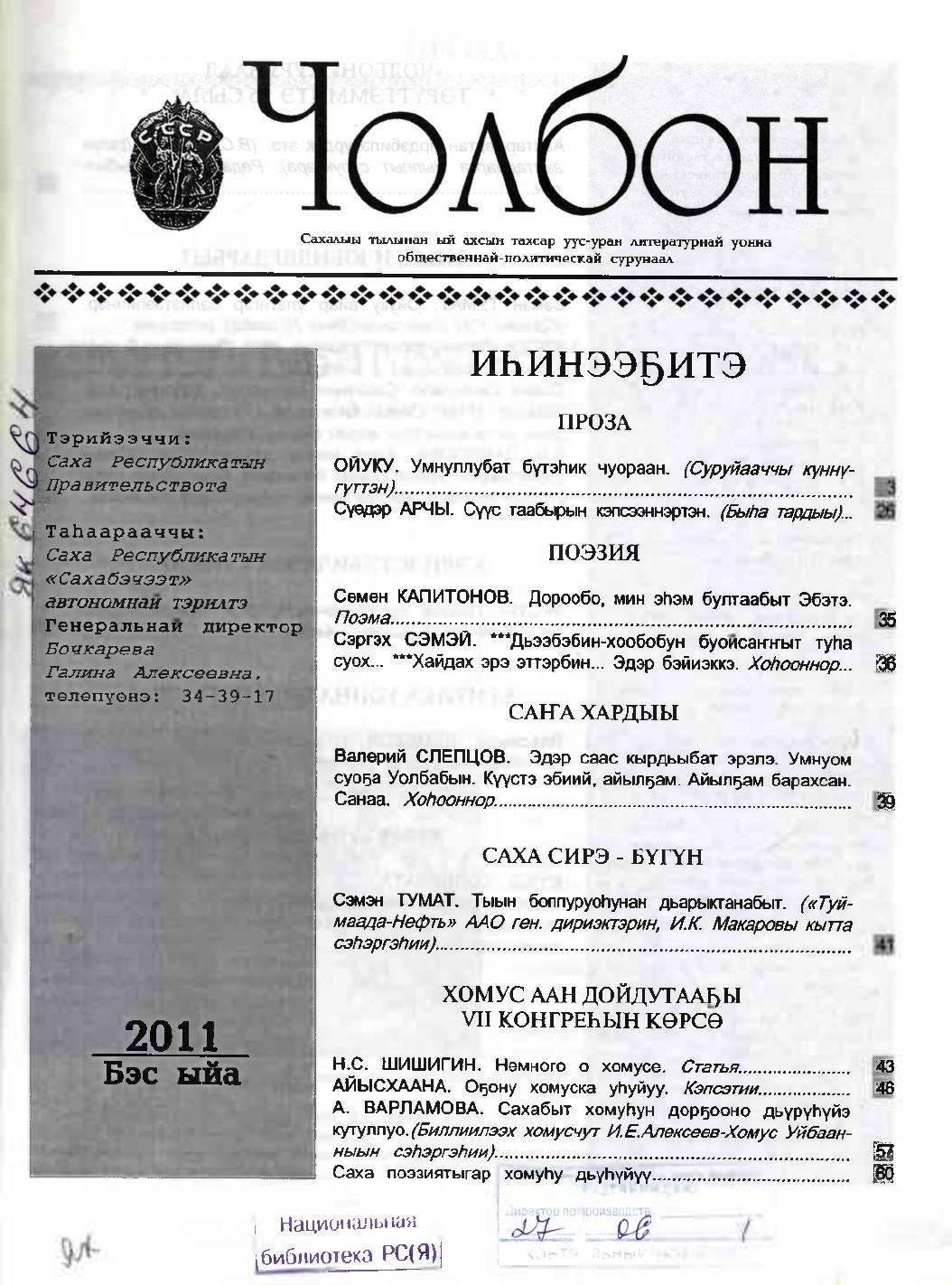 - 1. Чолбон: уус-уран литературнай уонна общественнай-политическай сурунаал, 2011, №1 (тохсунньу)