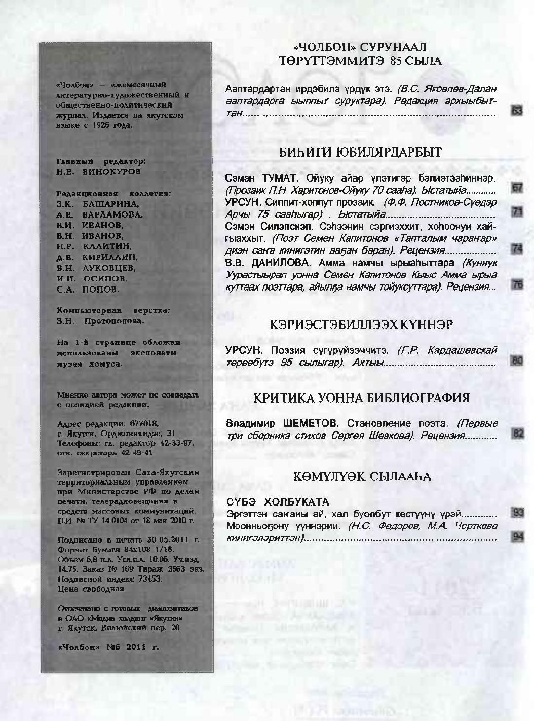 - 2. Чолбон: уус-уран литературнай уонна общественнай-политическай сурунаал, 2011, №2 (олунньу)